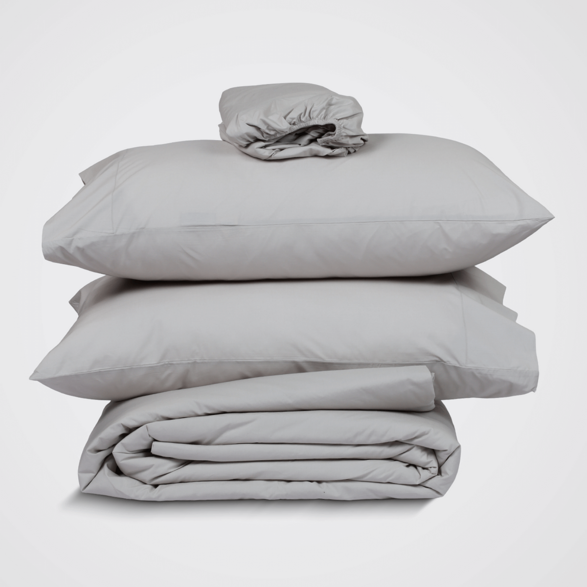 Our Light Grey crisp & cool percale duvet set is perfect for creating a beautiful bedscape. The set includes 1 duvet cover, 1 fitted sheet and 2 standard-size pillowcases. These bed linens are made of cotton, and it doesn’t trap heat. The traditional crisscross pattern weave of the fabric enhances durability and remains the choice of many seeking premium comfort and timeless style.